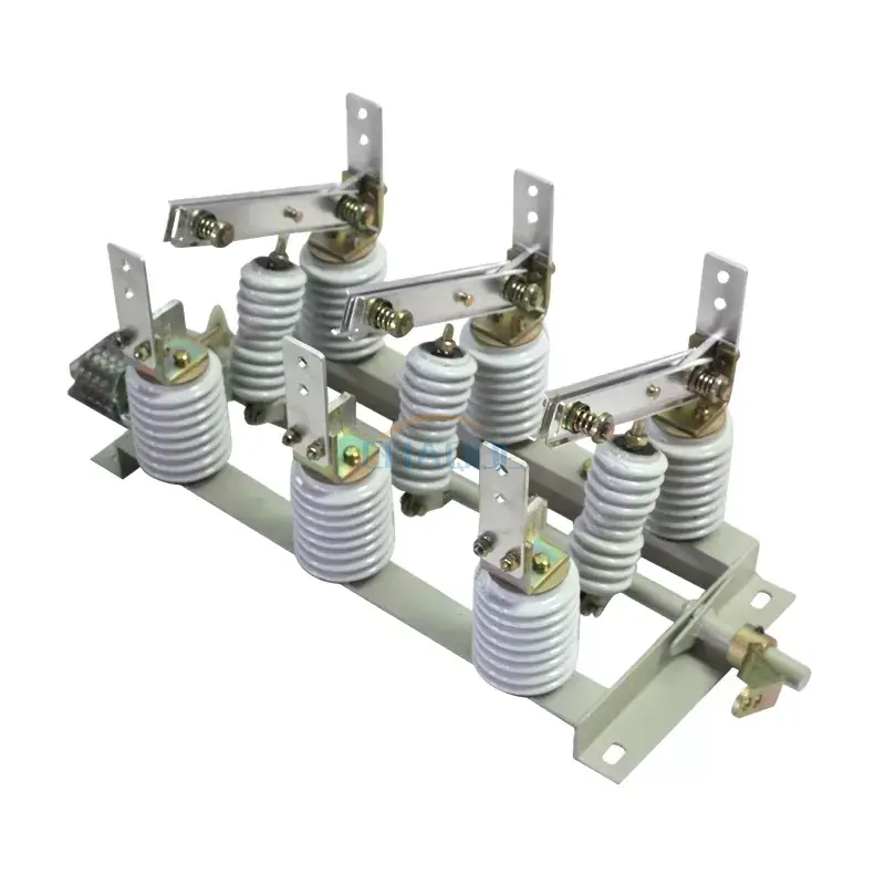 Anqiang Power の屋内高圧断路スイッチは 3 極タイプで、ベース フレーム、回転シャフト、接続ロッド、磁器ポスト絶縁体、スイッチ ブレード、端子台で構成されています。回転軸はベースフレームに取り付けられており、その上部には 3 対のレバーが溶接されています。これらのレバーは、コンロッドと磁器絶縁体を介してスイッチブレードに接続されています。回転軸はベースフレームから伸びており、その任意の部分を操作機構に接続することができます。 GN19-12Wは耐汚染タイプです。 GN19-12Gは高地用です。 GN19-12X にはライブ電圧インジケーターが内蔵されています。 GN19-12STは双投タイプの断路器です。